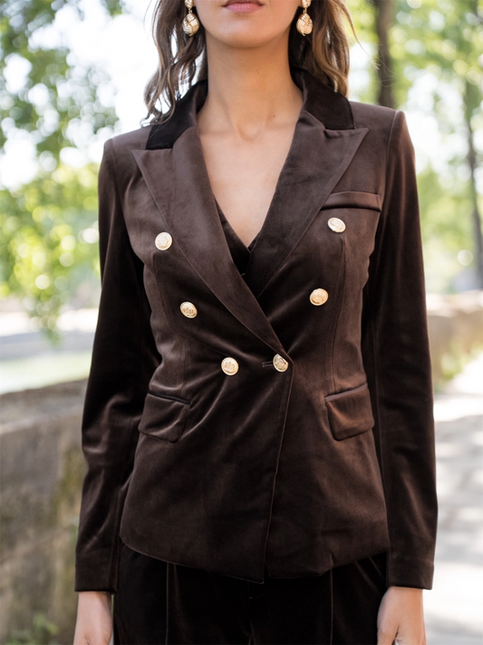 Double Breasted Velvet Blazer W/Gold Buttons - Choco