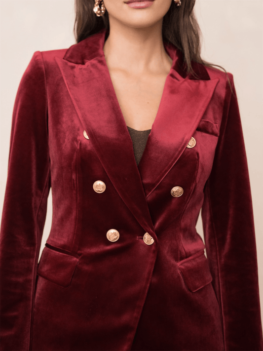 Double Breasted Velvet Blazer W/Gold Buttons - Dark Burgundy