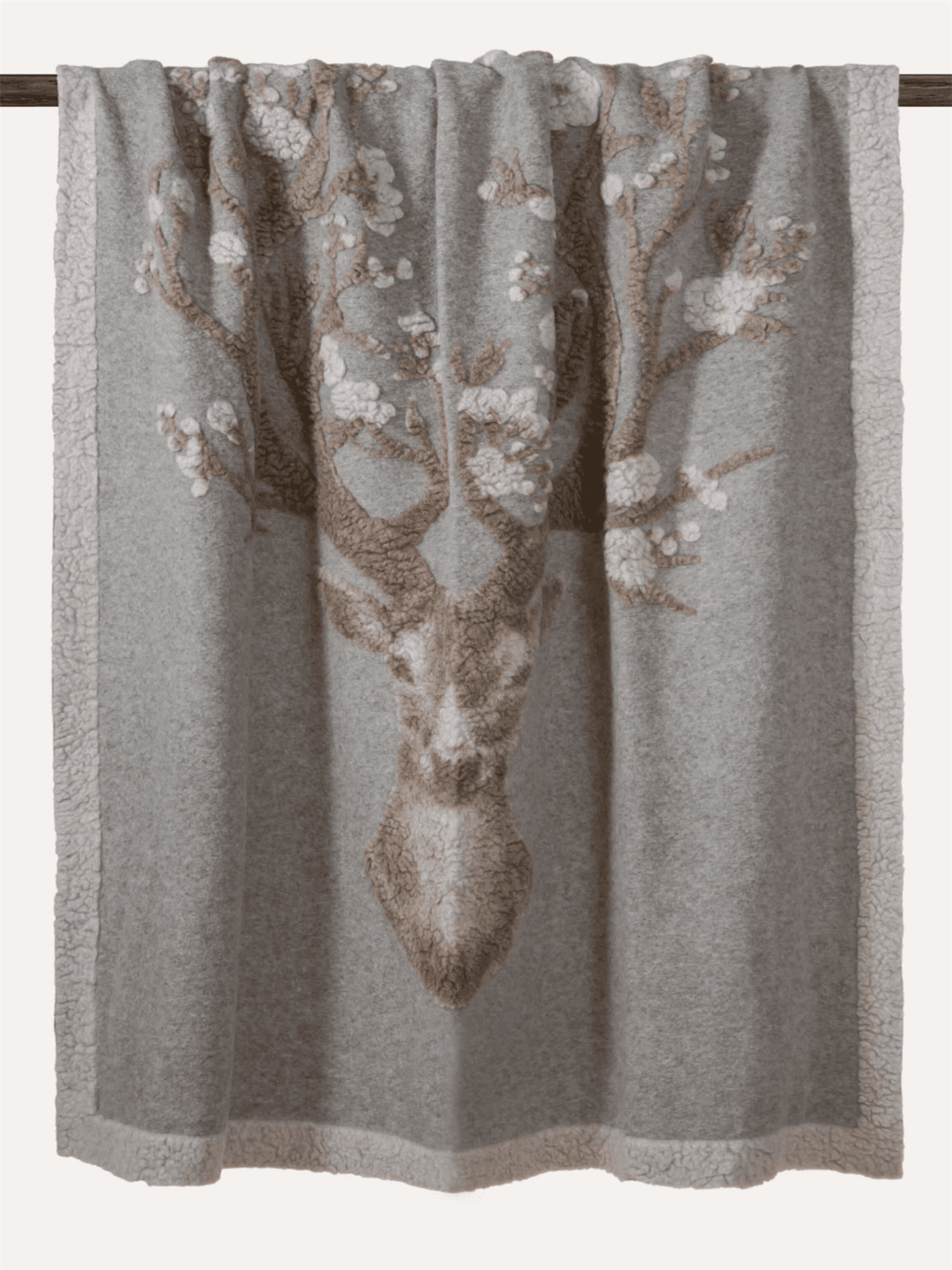 Det perfekte pleddet til vinterhytta, med nydelig hjort fra FRATI Home! Pleddet er i en varm og god kvalitet med teksturerte detaljer. Pleddet har motiv av hjort med snødekket gevir.