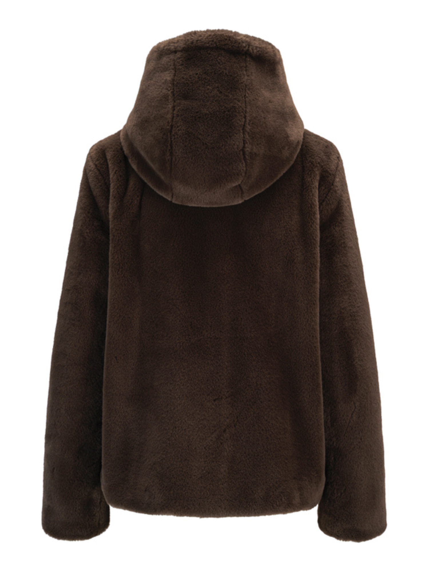 Superkul fuskepels jakke fra ella&il! Jakken er i en kort form med gjemte knapper, rett passform og stor hette. Denne gir en superkul look til ethvert antrekk når man trenger litt varme. Denne jakken er i en klassisk brun farge.