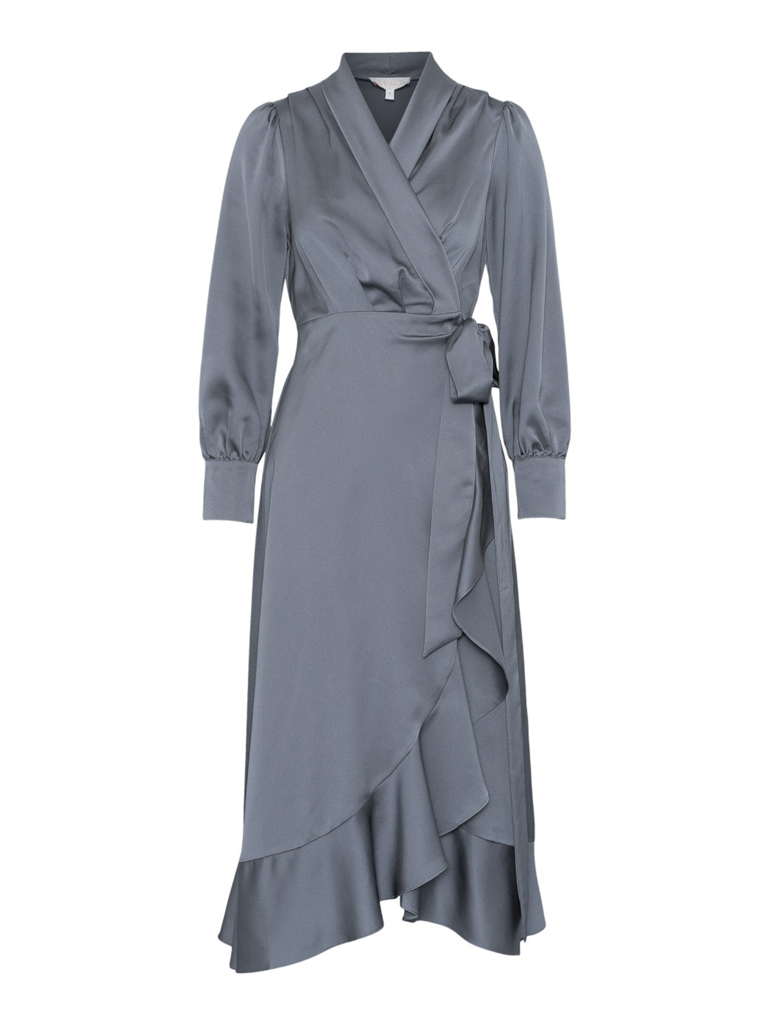 Bestselgende Iza Mini Dress fra Love Lolita! Kjole med omslag i en fin sølvgrå farge som gjør litt ut av seg. Kjolen har paneler i midjen som gir et strukturert og feminint utrykk i midjen. Kjolen har også nydelig knytesnorer i midjen, knapper på mansjettene og krage . Perfekt allsidig kjole!
