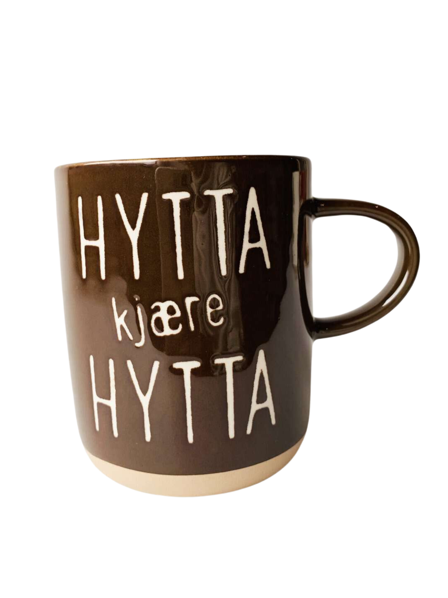 Krus med hyttetekst fra Trend Design! Kruset er i en mørkebrun farge med teksten "hytta kjære hytta". Den perfekte kakaokoppen til hyttelivet!