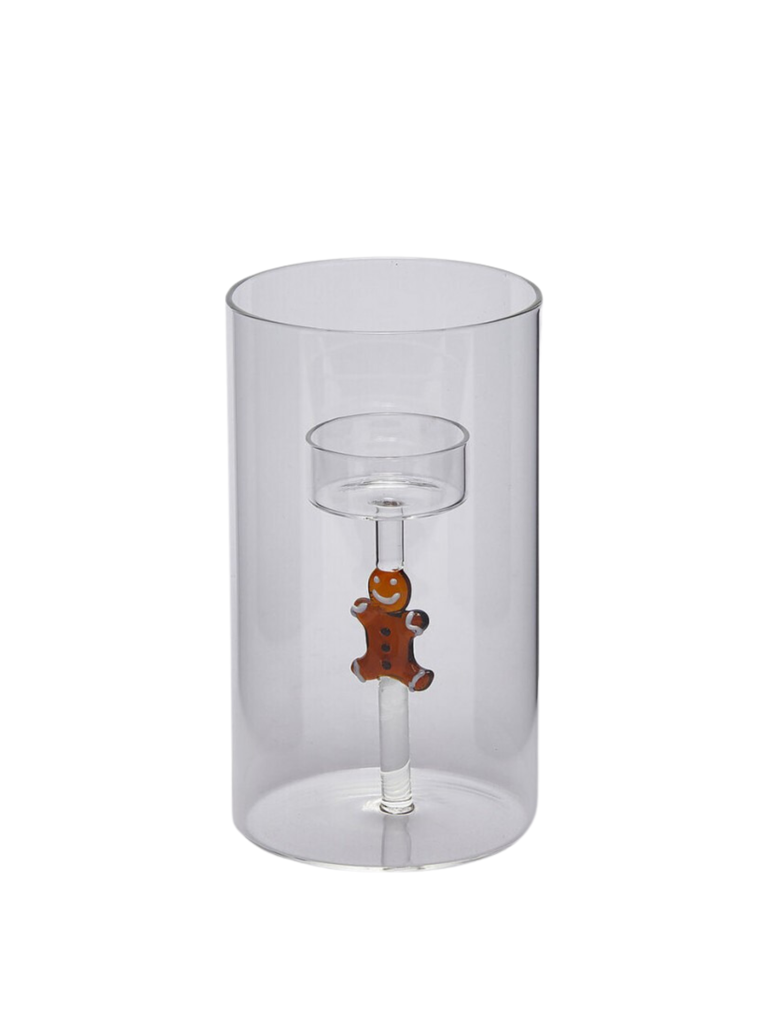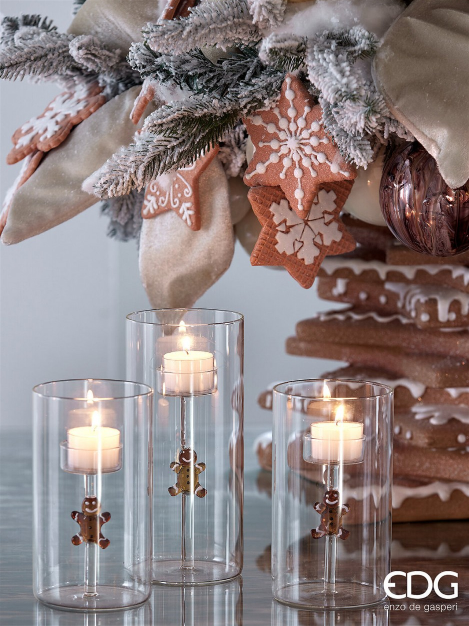 Telysholder med julemotiv fra EDG! Nydelig lysholder som passer til telys i glass. Lysholderen har en pepperkakemann i glass på innsiden som holder telyset.
