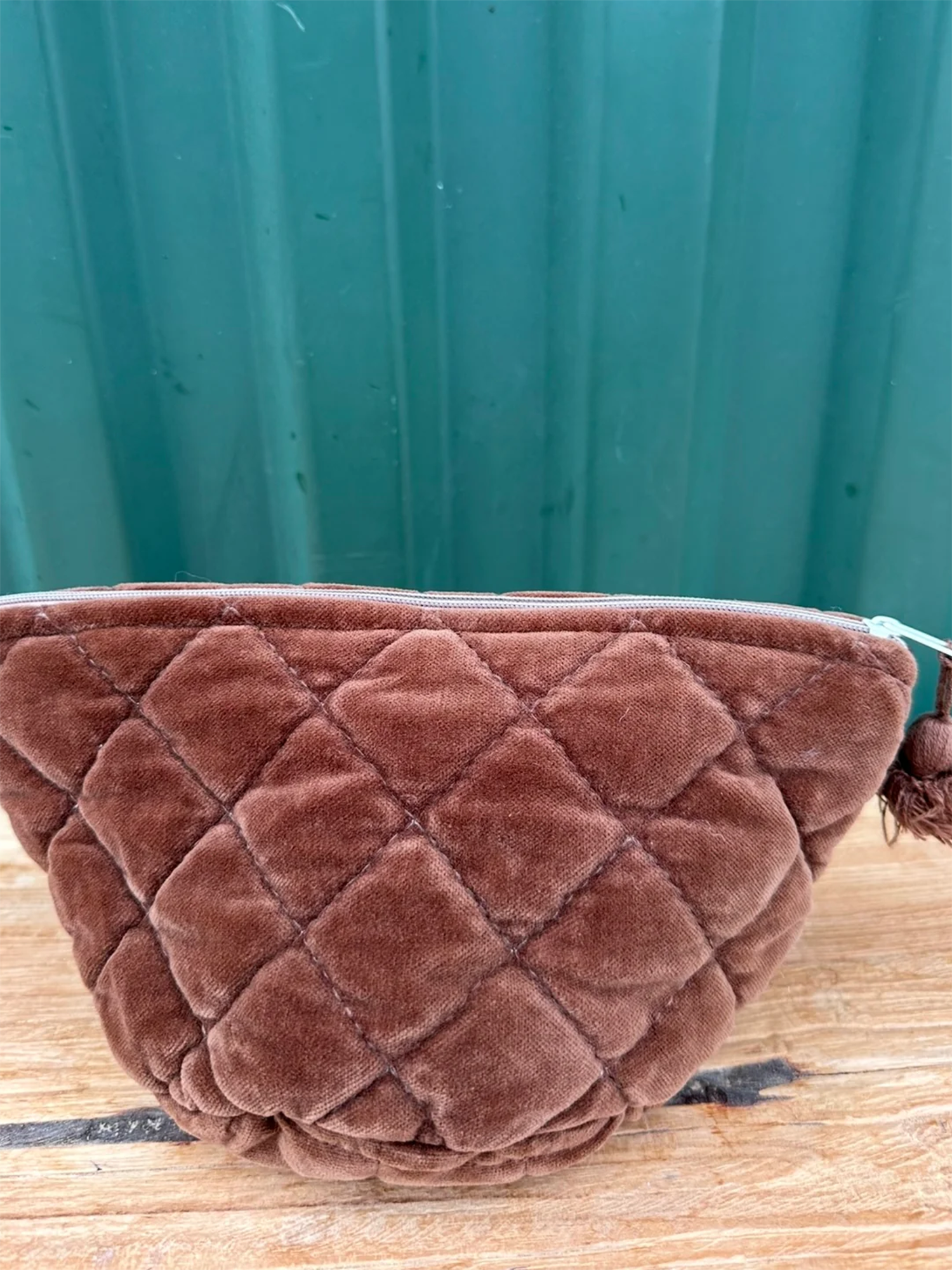 Nydelig quiltet sminkepung i velur fra Anouska! Quiltet sminkepung i mykt materiale, med steinvasket utseende. Chocolate er en rik brunfarge med rød undertone.