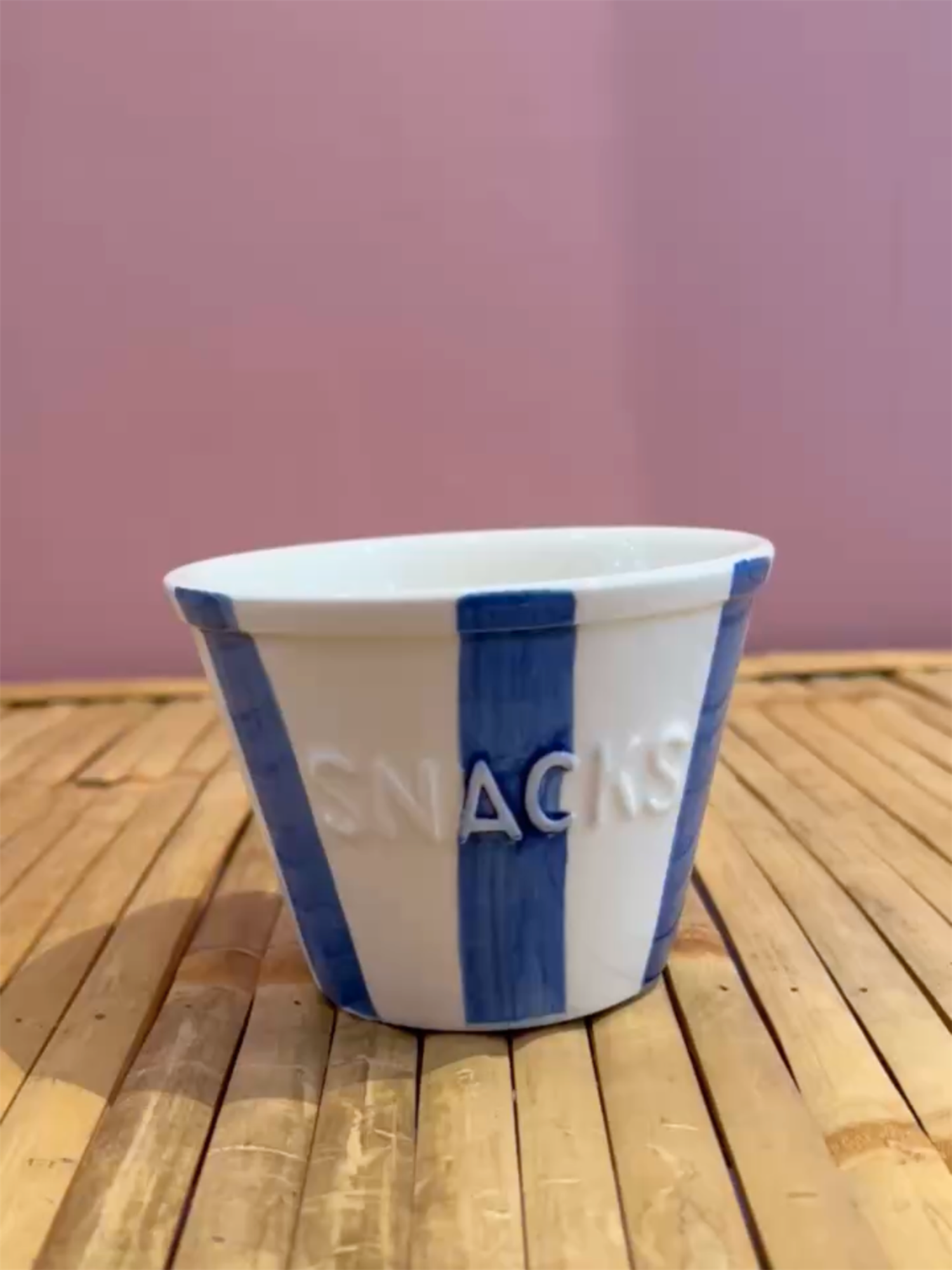 Herlig snacksskål i fargen Blåstripet med hvit tekst fra Bruka Design Stockholm. Skålen er håndmalt i Portugal.
