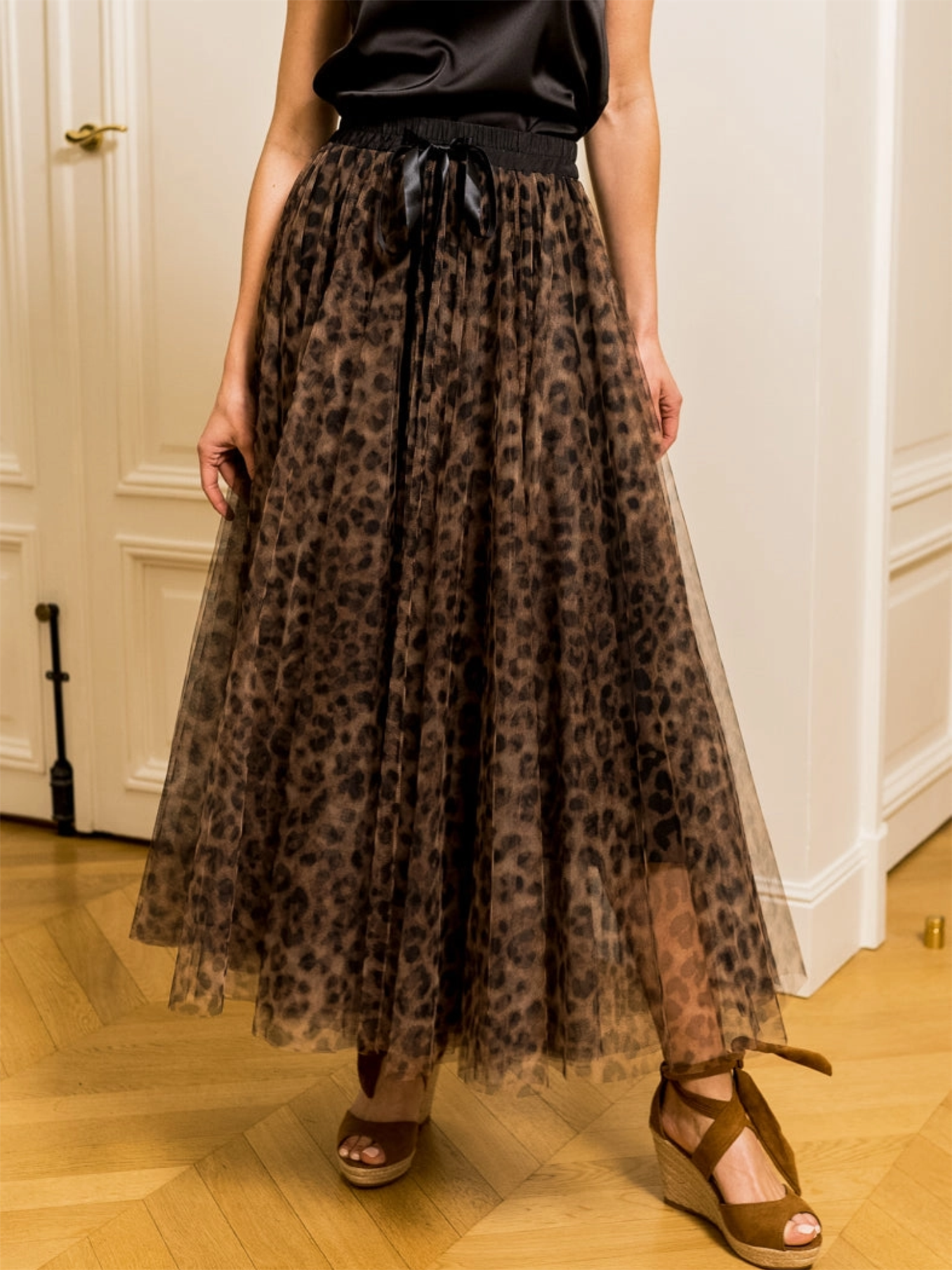 Tyll skjørt i leopardmønster med satengknyting i livet fra Choklate Paris! Langt tyllskjørt med elastisk kant i midjen, flared passform og sateng knyting.