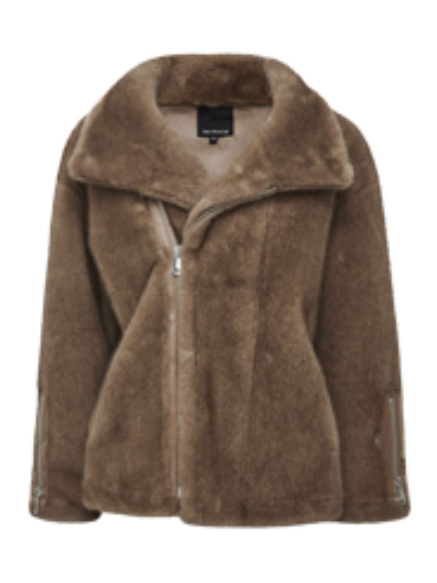 Kort fuske pels jakke fra Ane Mone! Nydelig brun farge med skinn detaljer.