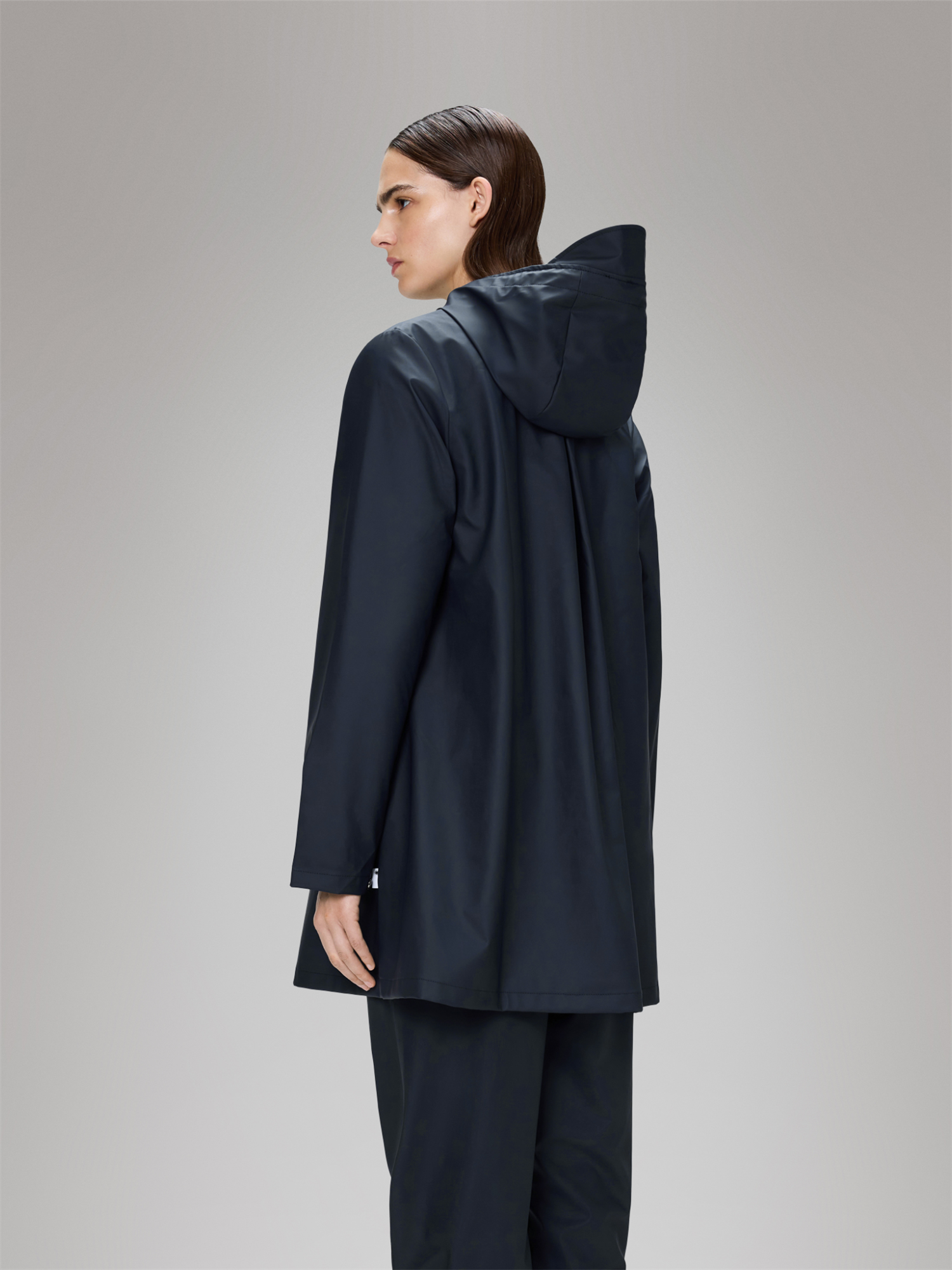 A-Line Jacket er laget i Rains’ signaturstoff i PU og har sveisede sømmer, som gjør jakken både vann- og vindtett. Overflaten er lett med en glatt finish.