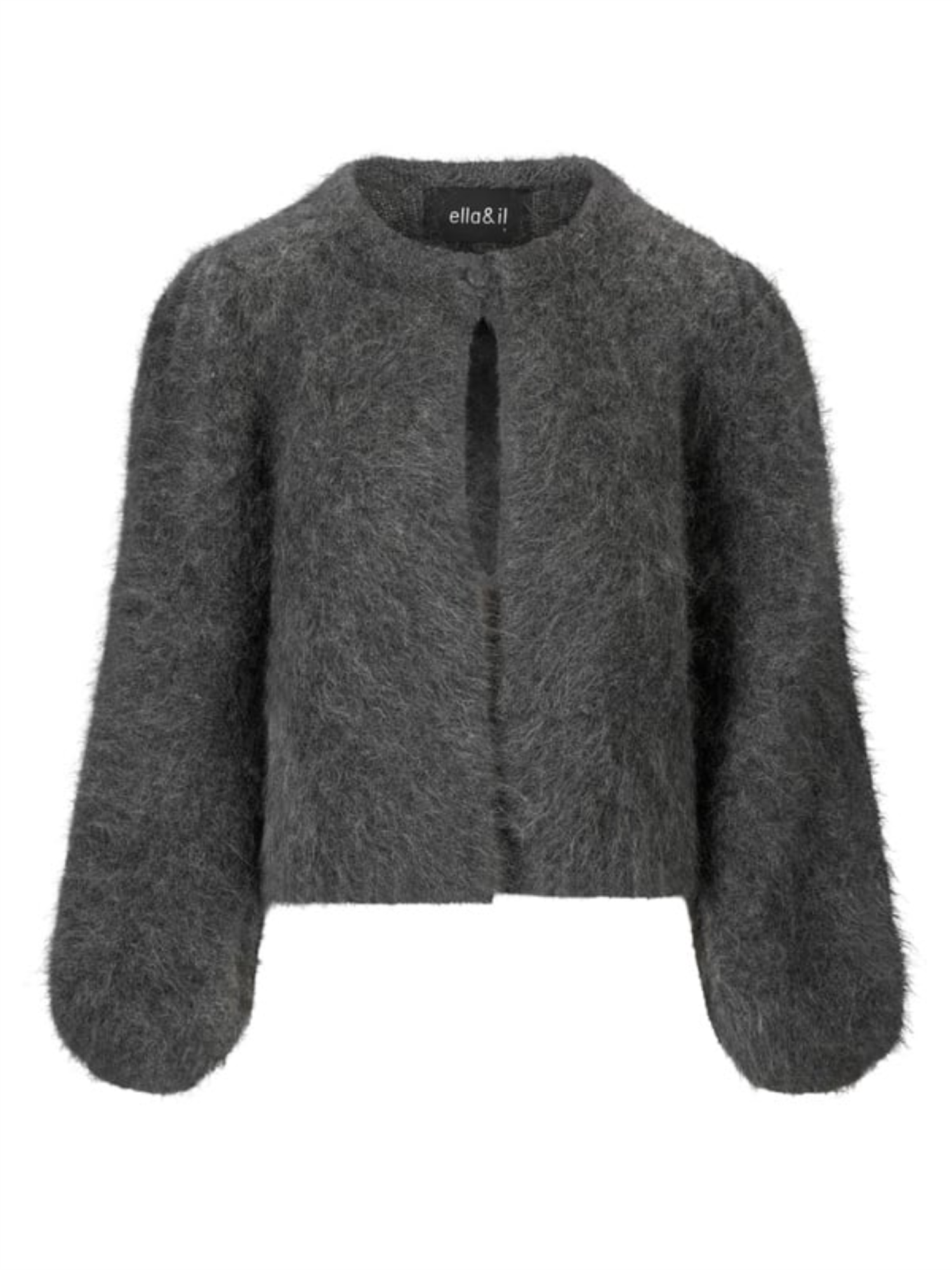 Superdeilig cardigan med knapp fra Ella&il! Cardiganen er i en A silhuett med rund hals, ballongermer og åpen front med lukking i kragen.